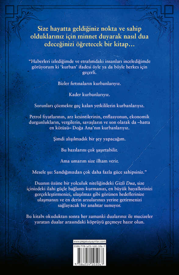 Duanın özüne bir yolculuk niteliğindeki Gizli Dua, size içinizdeki ilahi güçle bağlantı kurmanızı, en büyük hayallerinizi gerçekleştirmenizi, ulaşılmaz gibi görünen hedeflerinize ulaşmanızı ve en derin arzularınızı yerine getirmenizi sağlayacak bir anahtar sunuyor.